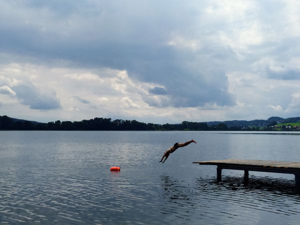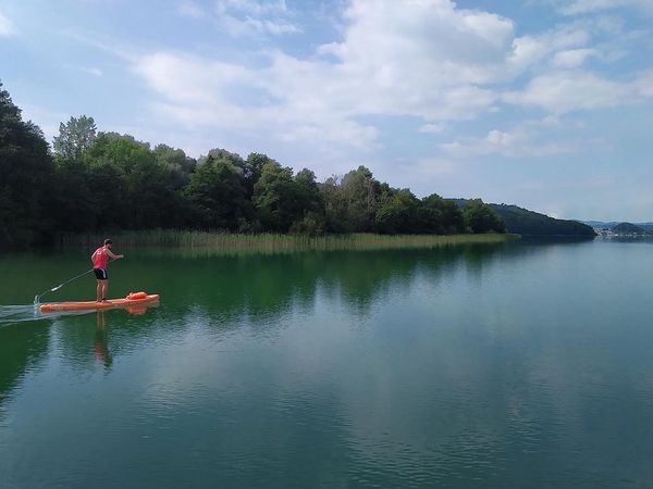 One August morning, I start in Gebertsham, pumping air into my SUP in the Strandbad. The pump breaks halfway through; I decide to still go ahead and paddle the 5 km across Mattsee, under a low bridge into Obertrumer See and towards Wartstein. A small chapel built in the 18th century to honour Saint Anne sits on a rock a few metres above the shore. Today, it’s a popular hiking destination. From here, I continue swimming across the lake to Seeham; accompanied by my sister, who takes over the SUP.