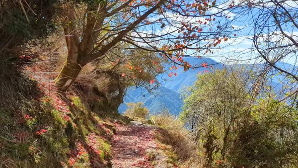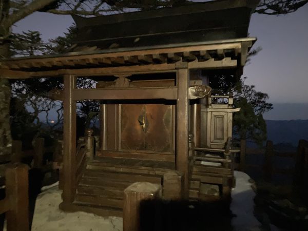 There’s a cold wind blowing over the mountain. As I inch closer to the peak, the trail becomes more exposed to it and it gets pretty chilly. I reach the peak and quickly descend to a small 山神廟 Japanese shrine about 100 metres below. I was hoping to find shelter from the wind, but it’s still pretty cold. I manage to change my sweaty shirt for a dry one and, like an onion, peel myself back into my multiple layers of clothes. Then, I quickly head back up to the peak and begin my descend.