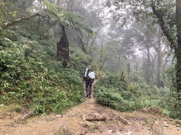 We carry our tent, gear and water for the 2D1N trip. Most importantly, this is my first hike in truly “Taiwanese style”, sporting a pair of plastic rain boots. While an odd sight to European eyes, it’s pretty typical attire among local hikers. And finally, this is a trail where it makes A LOT of sense.