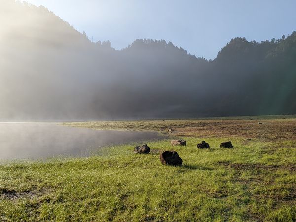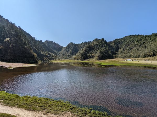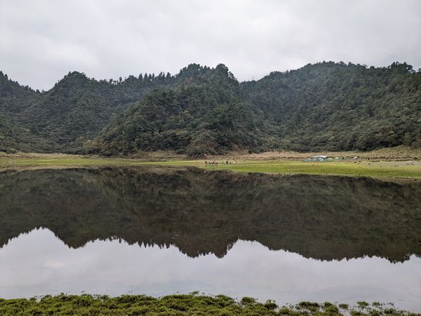 The following morning, we wake up to a clear sky as the sun slowly creeps up behind the ridgeline we hiked down from the previous day. Golden morning light enfolds the lake in bright colours, the grass around its shore shining in a vivid green. We watch this spectacle of lights for some time, before we finally take down our tents and embark on the journey back.