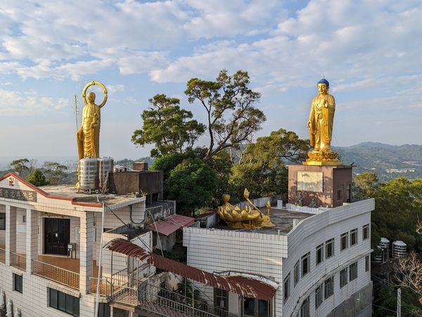 Fiercely looking stone sculptures protect the temple. Golden statues overlook the area from the top of one of the buildings. A tower structure on the far side of the complex has walls filled with various Buddhist artefacts. I climb to the top for a better view. The green hills of Dakeng invite further exploration. The sounds of Taichung can be heard in the distance.